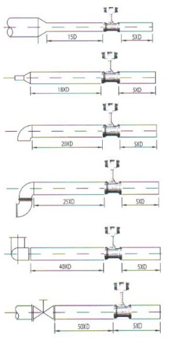 若傳感器安裝點(diǎn)的上游有90°彎頭或下形接頭,傳感器上游應(yīng)有不小于20D的等徑直管段,下游應(yīng)有不小于5D的等徑直管段,