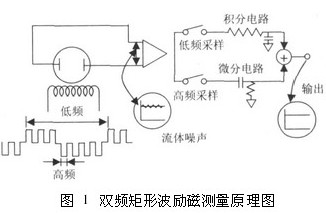 雙頻矩形波勵磁測量原理如圖1所示,一個由高低頻分量迭加而成的電磁場通過勵磁線圈被施加到被測液體中,勵磁波形是在一個低頻矩形波上迭加一個高于市電頻率的矩形波而得到的波形。在產生的電動勢中,低頻分量通過一個大時間常數的積分電路獲得一個零點穩(wěn)定性好的平穩(wěn)流量信號。而由漿液或低電導率流體產生的低頻噪聲可被不受噪聲影響的高頻采樣電路所抑制,有著同樣時間常數的流量信號經過一個差分電路以確定流速信號的變化,把這兩種不同頻率采樣所得的信號結合起來可獲得一個穩(wěn)定流速信號,該信號不受噪聲干擾,且有較高的零點穩(wěn)定性。