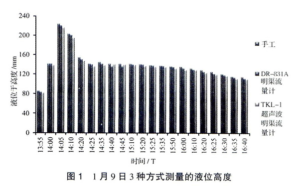 見圖3,以手工實(shí)測(cè)液位高度為基準(zhǔn),2種流量計(jì)的誤差均在±5%的范圍內(nèi)。除在1月9日14∶40和14∶45兩個(gè)時(shí)間點(diǎn)測(cè)量值表現(xiàn)出DR-831A測(cè)量誤差高于TKL-Ⅰ外,其他時(shí)段都明顯表現(xiàn)出DR-831A測(cè)量誤差小于TKL-Ⅰ。