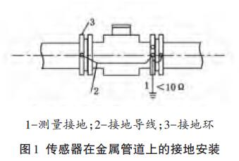 (4) 傳感器安裝在金屬管道上,可將傳感器的接地導(dǎo)線按制造廠的要求連接在2側(cè)管道法蘭上,形成可靠的接地回路(見圖1)。儀表的接地點(diǎn)應(yīng)是一個獨(dú)立的接地點(diǎn),不允許與其他電氣設(shè)備的接地線連接在一起。