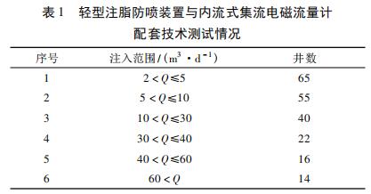 在實(shí)際應(yīng)用中,使用輕型注脂防噴裝置與內(nèi)流式集流一體式電磁流量計(jì)配套技術(shù)對(duì)喇叭口在射孔層上注聚井進(jìn)行測(cè)試。輕型注脂防噴裝置與內(nèi)流式集流一體式電磁流量計(jì)配套技術(shù)施工工藝參見文獻(xiàn),測(cè)試情況見表 1 所示,低注入量井( ≤10 m3 /d) 占到 56. 60% 。