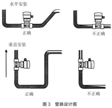 現(xiàn)場(chǎng)安裝時(shí)應(yīng)注意遠(yuǎn)離可能對(duì)其產(chǎn)生干擾的大型設(shè)備,防止長(zhǎng)期的熱輻射和其他如磁場(chǎng)直射等環(huán)境影響。為確保高測(cè)量精度和較好的零點(diǎn)穩(wěn)定性,進(jìn)行校正前,二次供水流量計(jì)應(yīng)裝入工藝介質(zhì)中至少 24 小時(shí)電*鈍化。安裝的管路設(shè)計(jì)應(yīng)確保管道始終充滿流體,防止測(cè)量誤差,管路設(shè)計(jì)圖見(jiàn)圖 3。