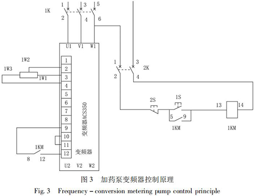 STD - Ⅲ型浮選工藝參數(shù)自動測控系統(tǒng)通過雙膜盒差壓計測量原礦漿濃度; 采用耐腐蝕流量計測量原礦漿流量,由 PLC 計算出入浮干煤泥量和藥劑的瞬時添加量,用變頻式計量泵完成浮選藥劑的添加。通過上位機還可以打印小時、班、天及月的運行數(shù)據(jù),更加有利于生產(chǎn)管理及技術(shù)分析,藥劑自動原理如圖 2 所示,k1、k2、k3 是計算修正參數(shù)。以 PID 算法為核心,通過優(yōu)化控制程序計算出藥劑給定量,在捕收劑和起泡劑管道上分別安裝藥劑測量裝置,用于檢測藥劑的添加量。當藥劑測量值小于藥劑給定量時,PID 輸出增大,反之則減小。加藥泵變頻器控制原理如圖 3 所示。