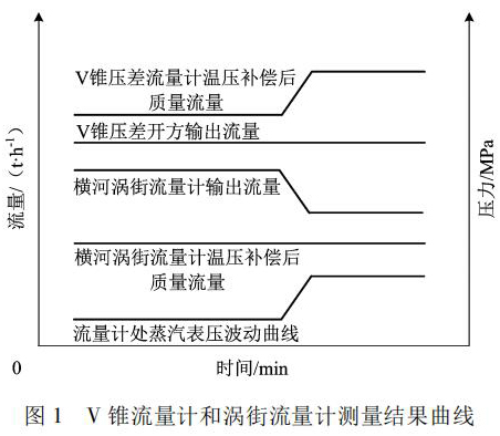 根據(jù)物料平衡反復(fù)研究,渦街流量計(jì)測(cè)量的質(zhì)量流量動(dòng)態(tài)曲線比較客觀反映了蒸汽流量的變化; 而 V 錐流量計(jì)測(cè)量的質(zhì)量流量偏大 5%。說明該差壓流量計(jì)元件沒能產(chǎn)生和實(shí)際流量變化對(duì)應(yīng)的差壓。