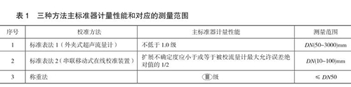 本規(guī)范包含三種校準(zhǔn)方法,分別為標(biāo)準(zhǔn)表法 1(外夾式超聲流量計(jì))、標(biāo)準(zhǔn)表法 2(串聯(lián)移動(dòng)式在線校準(zhǔn)裝置)和稱重法,編制組對(duì)每種方法進(jìn)行了大量的實(shí)驗(yàn),并積*與智能電磁流量計(jì)生產(chǎn)廠家及用戶溝通探討,積累了豐富的經(jīng)驗(yàn),獲得了大量的實(shí)驗(yàn)數(shù)據(jù),*終確定三種方法的主標(biāo)準(zhǔn)器計(jì)量性能和對(duì)應(yīng)的測(cè)量范圍,如表 1 所示。
