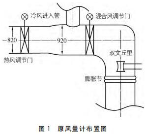 從流量測(cè)量角度講,影響流場(chǎng)的主要為熱風(fēng)調(diào)門、擴(kuò)管、彎頭以及一次冷風(fēng)的混入,閘板門和混合風(fēng)調(diào)門由于運(yùn)行時(shí)處于全開(kāi)狀態(tài),影響可忽略,目前使用了單點(diǎn)雙文丘里管的測(cè)量方式,有以下問(wèn)題: