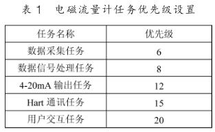 下面以電磁流量計(jì)為例說(shuō)明基于 μC/OS-III 的人機(jī)界面設(shè)計(jì)。 先將 μC/OS-III 移植到 Cortex-M3 處理器上,這里選用的是 STM32F103VET6 。電磁流量計(jì)的應(yīng)用程序若按照上節(jié)的任務(wù)種類劃分有: 數(shù)據(jù)采集任務(wù)、數(shù)據(jù)處理任務(wù), 4~20mA輸出任務(wù), Hart 通訊任務(wù)以及用戶交互任務(wù)。 先對(duì)不同的任務(wù)進(jìn)行優(yōu)先級(jí)的劃分,如表 1 所示。