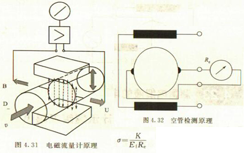 出水口流量計是專為測量導電液體的體積流量而設計的。測量原理是基于法拉*電磁感應定律。按照該定律,導電流體通過磁場作切割磁力線運動時,在垂直于磁場及流速的方向上產生感應電動勢,此電動勢由4.14節(jié)中的式4.24)給出。其原理如圖4.31所示。