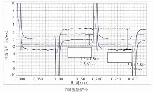 舉例,如圖5所示,線圈采用5Hz驅(qū)動(dòng)時(shí)的0feet/s,3.1feet/s,5.9feet/s流速下的電*信號,利用上述方法對信號進(jìn)行處理并計(jì)算流速。取每半波*后的20%納入流速計(jì)算,正半波與負(fù)半波相減即是流速。如3.1feet/s–(-2.8feet/s)=5.9feet/s,雖然有+0.15 feet/s的直流偏置,但也不影響流速的計(jì)算。因線圈是5Hz驅(qū)動(dòng),半波的20%是20ms,正好是1個(gè)完整的工頻周期,這樣就不受工頻干擾的影響。正半波與負(fù)半波相減,這樣就避免了直流偏置和共模干擾的影響。再加上在數(shù)字濾波過程中使用限幅濾波和算數(shù)平均,保證了流量信號的有效提取。