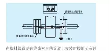 b.傳感器在塑料管道上或在有絕緣襯里的管道上安裝,傳感器的兩端應安裝接地環(huán)、或接地法蘭、或帶有接地電*的短管,按下圖接地。使管內(nèi)流動的被測介質(zhì)與大地短路,具有零電位,否則,廢水流量計無法正常工作。
