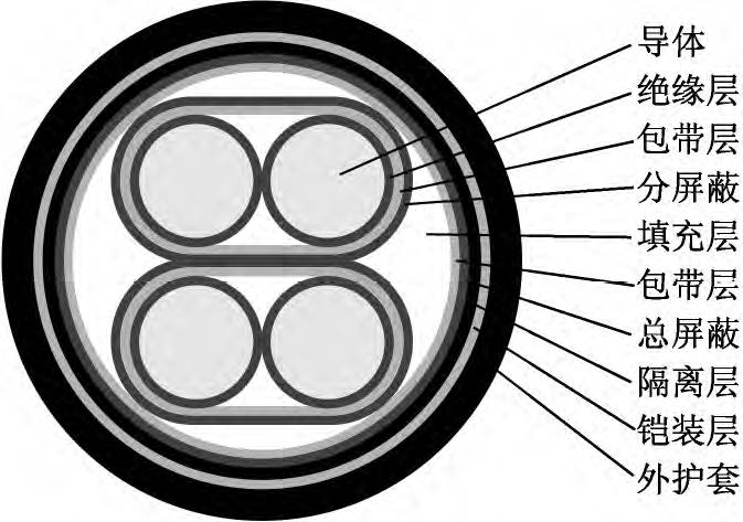 該新型電纜的結(jié)構(gòu)如圖1所示。導(dǎo)體為單股退火鍍錫軟銅線,以提高導(dǎo)體的導(dǎo)電性和防腐蝕性。在導(dǎo)體外繞包一層?。疲矗ň鬯姆蚁┌雽?dǎo)電帶,有利于降低導(dǎo)體和絕緣之間的摩擦起電噪音。絕緣采用材料較為純凈、介電常數(shù)較小、具有一定彈性的聚丙烯絕緣級材料,并采用擠壓式擠出,減小絕緣層與導(dǎo)體的間隙。采用對絞組作為信號傳輸線,由于在兩根傳輸線上感應(yīng)的電壓接近相等,減小了電壓差值,提高了信號傳輸穩(wěn)定性;對絞組由兩種不同顏色絕緣線芯組成,相鄰線對對絞節(jié)距應(yīng)不大于100mm。對絞分屏蔽組(即對對絞組進(jìn)行分屏蔽,每對對絞組外繞包兩層聚酯帶和一層厚0.04mm鋁塑復(fù)合帶繞包,內(nèi)置一根7×0.26mm鍍錫銅絞線作引流線)有利于對不同對絞組之間信號串音的抑制和隔離。對絞分屏蔽組同心式絞合成纜,在對絞分屏蔽組間填充非吸濕性材料,以保證纜芯圓整。在成纜纜芯外繞包兩層聚酯帶,再采用鋁塑復(fù)合帶繞包,內(nèi)置鍍錫銅線作引流線,以提高電纜電磁屏蔽能力。總屏蔽層外擠包隔離層(隔離護(hù)套),隔離層采用絕緣級低密度聚乙烯材料。隔離層外采用鎧裝層,鎧裝材料為高導(dǎo)磁合金鋼帶,其為強(qiáng)磁材料,可將外來的磁通大部分限制在鎧裝層的外表面上(僅有少部分能進(jìn)入被屏蔽的空間);鎧裝時對高導(dǎo)磁合金鋼帶采用縱包焊接,確保其形成一連續(xù)圓柱管;鎧裝層可提高電纜抗電磁干擾水平以及對電纜進(jìn)行加強(qiáng),減少電纜振動引起的電動勢。外護(hù)套采用藍(lán)色軟PVC(聚氯乙烯)護(hù)層級電纜材料擠包,實現(xiàn)電纜防護(hù)。