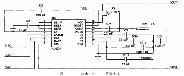 HT2012需要外部提供460.8kHz的時(shí)鐘信號(hào),且要求時(shí)鐘頻率的誤差是0.1%,若直接入一個(gè)460.8kHz的晶振不僅會(huì)引起系統(tǒng)功耗的增加,而且該晶振屬于非標(biāo)準(zhǔn)晶振,需專(zhuān)門(mén)定制。為了解決這一問(wèn)題,在系統(tǒng)中采用一片1.8432MHz的晶振以產(chǎn)生時(shí)鐘信號(hào),再經(jīng)分頻器CD4013進(jìn)行4分頗,可輸出1.8432MHz/4=460.8kHz的分頻信號(hào)供HT2012使用。AD421其內(nèi)部的電壓調(diào)節(jié)器與外部的場(chǎng)效應(yīng)管DN25D對(duì)輸入到AD421的電壓進(jìn)行調(diào)整,可提供+3.3V電壓作為其他設(shè)備的電源。HART發(fā)出的FSK信號(hào),經(jīng)過(guò)一個(gè)電容耦合送到AD421中,轉(zhuǎn)換成相應(yīng)的0.5mA正弦電流信號(hào),實(shí)現(xiàn)電壓信號(hào)到電流信號(hào)的轉(zhuǎn)換,同時(shí),疊加在4~20mA的電流上送給接收設(shè)備,實(shí)現(xiàn)了HART協(xié)議的信息的交換。本電路耦合電容取為0.0033μF,如圖5所示。