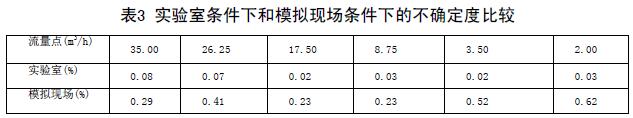 實(shí)驗(yàn)室條件下和模擬現(xiàn)場條件下的不確定度比較(表3)兩次結(jié)果可以看出,兩次實(shí)驗(yàn)各個(gè)流量點(diǎn)的不確定度差距非常大??梢姡?strong>砂漿流量計(jì)對(duì)安裝條件還是比較苛刻的。