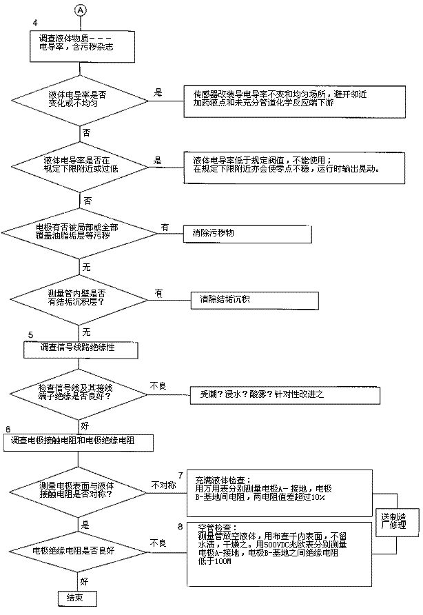 檢查流程圖*3項(xiàng)。管道雜散電流等外界干擾影響主要靠液體流量計(jì)良好的接地保護(hù),通常要求接地電阻小于1000,不要和具他電機(jī)電器共用接地。有時(shí)候環(huán)境條件較好,液體流量計(jì)不接地亦能正常工作,但是一旦良好環(huán)境不存在,儀表會(huì)出現(xiàn)故障,屆時(shí)再作檢查會(huì)帶來(lái)堵多麻煩。
